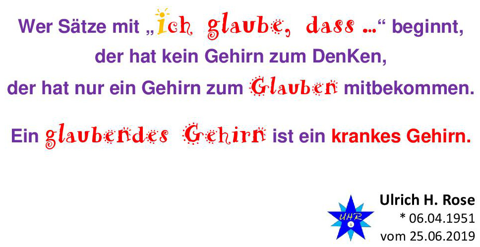 Wer Sätze mit „Ich glaube, dass …“ beginnt, der hat keine Gehirn zum DenKen, der hat nur ein Gehirn zum Glauben mitbekommen. Ein glaubendes Gehirn ist ein krankes Gehirn. Spruch von Ulrich H. Rose vom 25.06.2019