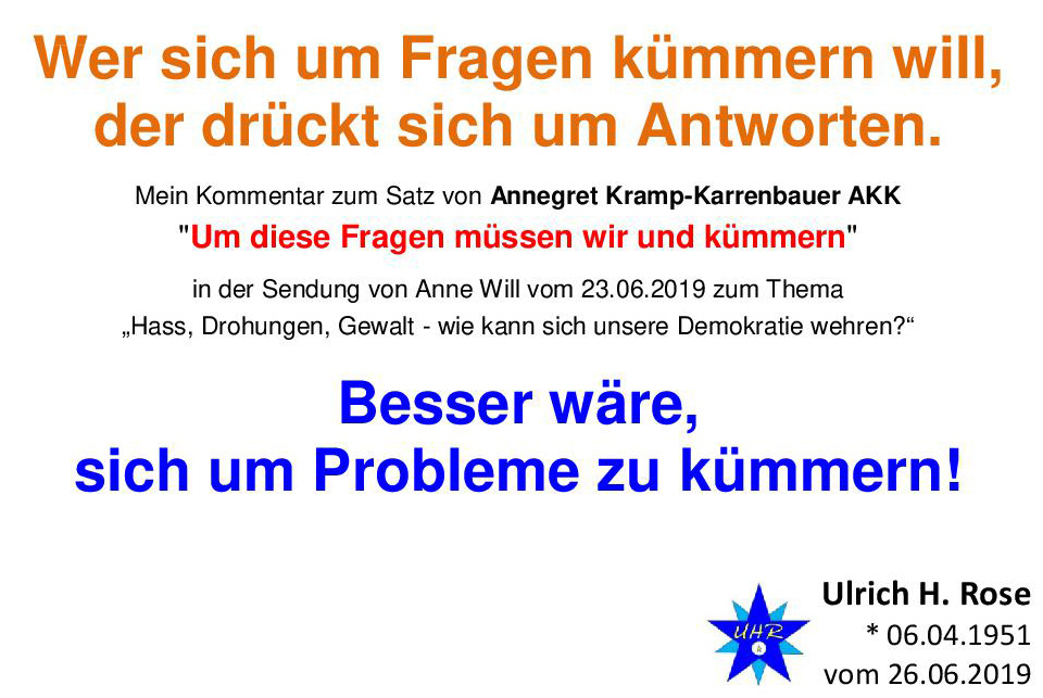 Wer sich um Fragen kümmern will, der drückt sich um Antworten. Mein Kommentar zum Satz von Annegret Kramp-Karrenbauer AKK „Um diese Fragen müssen wir und kümmern“ in der Sendung von Anne Will vom 23.06.2019 zum Thema „Hass, Drohungen, Gewalt – wie kann sich unsere Demokratie wehren?“ Besser wäre, sich um Probleme zu kümmern! Ulrich H. Rose vom 26.06.2019