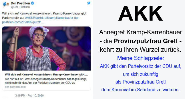 Will sich auf Karneval konzentrieren Kramp-Karrenbauer gibt Parteivorsitz auf 10. Feb. 2020. AKK. Annegret Kramp-Karrenbauer – die Provinzputzfrau Gretl – kehrt zu ihren Wurzel zurück. Meine Schlagzeile: AKK gibt den Parteivorsitz der CDU auf, um sich zukünftig als Provinzputzfrau Gretl dem Karneval im Saarland zu widmen.