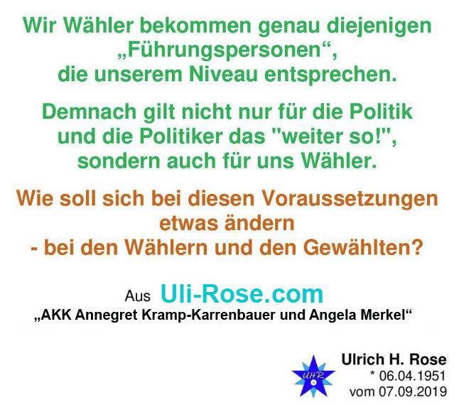 Wir Wähler bekommen genau diejenigen „Führungspersonen“, die unserem Niveau entsprechen. Demnach gilt nicht nur für die Politik und die Politiker das „weiter so!“, sondern auch für uns Wähler. Wie soll sich bei diesen Voraussetzungen etwas ändern – bei den Wählern und den Gewählten? Ulrich H. Rose vom 07.09.2019