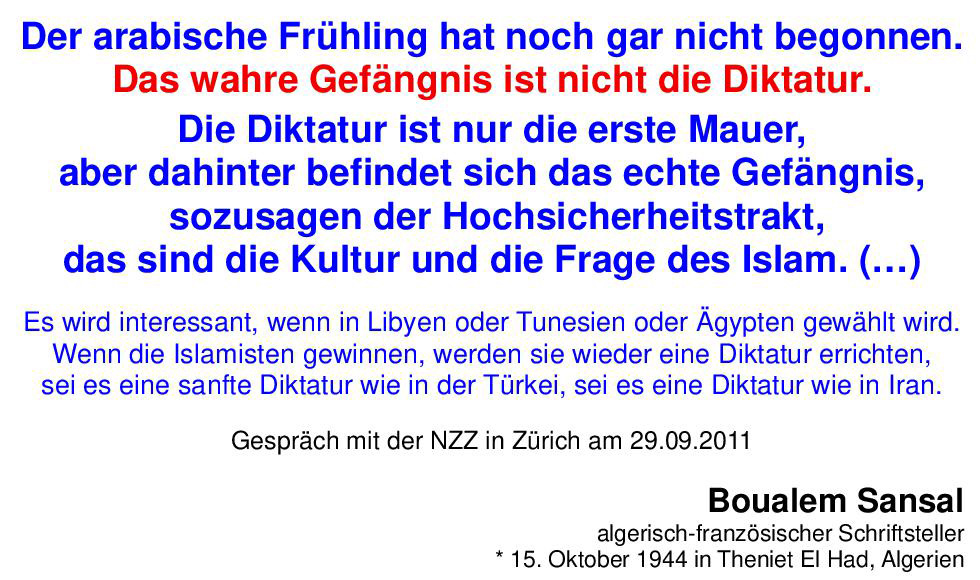 Der arabische Frühling hat noch gar nicht begonnen. Das wahre Gefängnis ist nicht die Diktatur. Die Diktatur ist nur die erste Mauer, aber dahinter befindet sich das echte Gefängnis, sozusagen der Hochsicherheitstrakt, das sind die Kultur und die Frage des Islam. (…) Es wird interessant, wenn in Libyen oder Tunesien oder Ägypten gewählt wird. Wenn die Islamisten gewinnen, werden sie wieder eine Diktatur errichten, sei es eine sanfte Diktatur wie in der Türkei, sei es eine Diktatur wie in Iran. Gespräch mit der NZZ in Zürich am 29.09.2011. Boualem Sansal, algerisch-französischer Schriftsteller.Boualem Sansal, * in Theniet El Had, Algerien mit unterschiedlichen Geburtsdaten, wie 19.09.1949, oder 1948, oder 15.10.1944