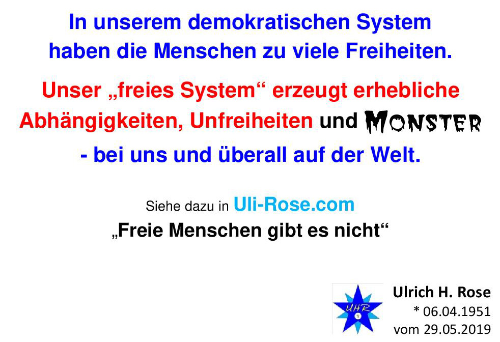 In unserem demokratischen System haben die Menschen zu viele Freiheiten. Unser „freies System“ erzeugt erhebliche Abhängigkeiten, Unfreiheiten und Monster – bei uns und überall auf der Welt. Spruch von Ulrich H. Rose vom 29.05.2019
