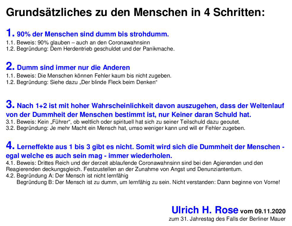 3. Nach 1+2 ist mit hoher Wahrscheinlichkeit davon auszugehen, dass der Weltenlauf von der Dummheit der Menschen bestimmt ist, nur Keiner daran Schuld hat.