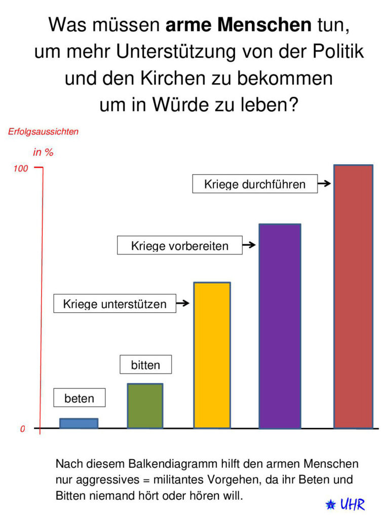 Auge um Auge – Zahn um Zahn hilft. Nach diesem Balkendiagramm hilft den armen Menschen nur aggressives = Militantes Vorgehen, da ihr Beten und Bitten niemand hört oder hören will.