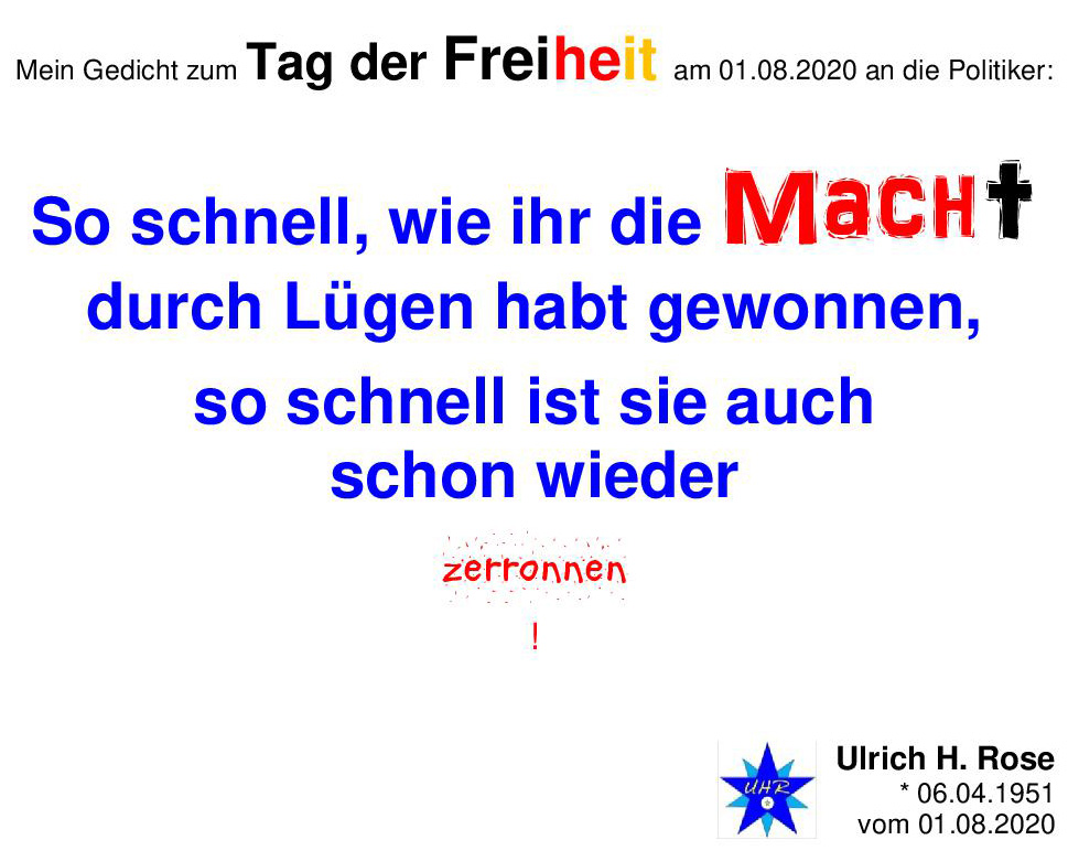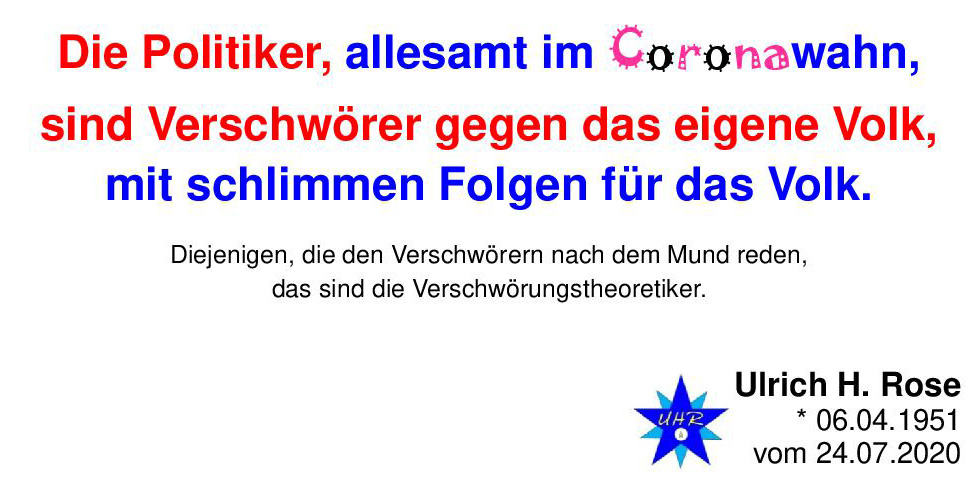 Die Politiker, allesamt im Coronawahn, sind Verschwörer gegen das eigene Volk, mit schlimmen Folgen für das Volk. Ulrich H. Rose vom 24.07.2020