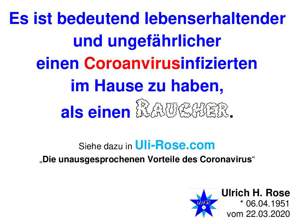 Es ist bedeutend lebenserhaltender und ungefährlicher einen Coroanvirusinfizierten im Hause zu haben, als einen Raucher. Spruch von Ulrich H. Rose vom 22.03.2020