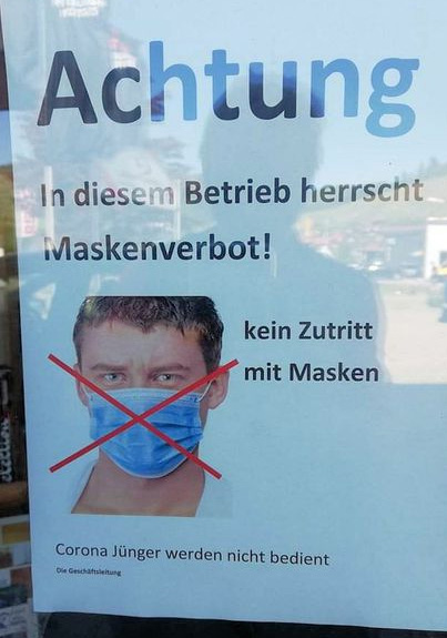 Maskenverbot! Kein Zutritt mit Masken! Corona-Jünger werden nicht bedient.