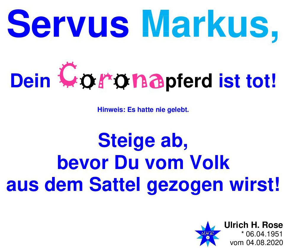 Servus Markus, Dein Coronapferd ist tot! Hinweis: Es hatte nie gelebt. Steige ab, bevor Du vom Volk aus dem Sattel gezogen wirst! Spruch von Ulrich H. Rose vom 04.08.2020
