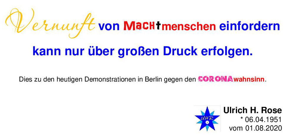 Erfolgsaussichten des deutschen Volkes gegen den Coronawahn der Politiker. Ulrich H. Rose vom 25.07.2020
