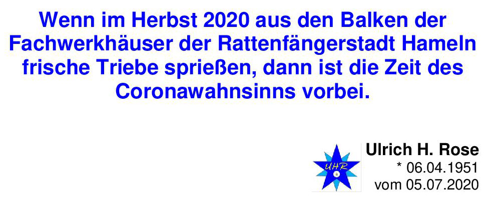 Wenn im Herbst 2020 aus den Balken der Fachwerkhäuser der Rattenfängerstadt Hameln frische Triebe sprießen, dann ist die Zeit des Coronawahnsinns vorbei. Spruch von Ulrich H. Rose vom 05.07.2020