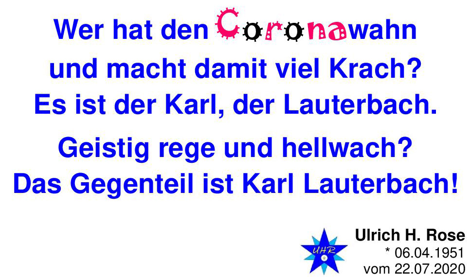 Wer hat den Coronawahn und macht damit viel Krach? Es ist der Karl, der Lauterbach. Geistig rege und hellwach? Das Gegenteil ist Karl Lauterbach!