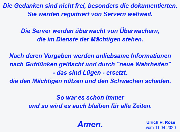 Rückblick vom 28.12.2020: In „Die unausgesprochenen Vorteile des Coronavirus“ berichte ich ab 12.03.2020 über den Coronawahnsinn. Dies geschah in der festen Annahme, dass dieser Wahnsinn schnell „in sich“ zusammenfällt. Das geschah leider nicht, so dass hier dieser Coronawahnsinn alles an Privatem überlagerte. Wer sich einen guten Überblick über die Corona-Chronik verschaffen will, der siehe bitte hier nach: „Coronawahnsinn ohne Ende