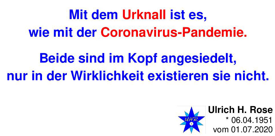 Mit dem Urknall ist es, wie mit der Coronaviruspandemie. Beide sind im Kopf angesiedelt, nur in der Wirklichkeit existieren sie nicht. Spruch von Ulrich H. Rose vom 01.07.2020