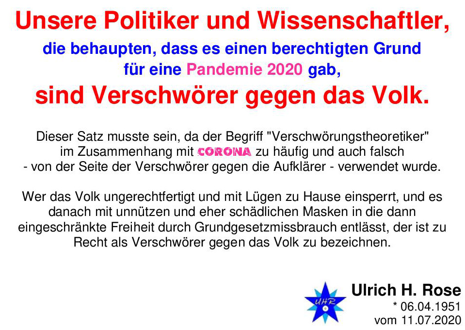 Unsere Politiker und Wissenschaftler, die behaupten, dass es einen berechtigten Grund für eine Pandemie 2020 gab, sind Verschwörer gegen das Volk. Dieser Satz musste sein, da der Begriff „Verschwörungstheoretiker“ im Zusammenhang mit Corona zu häufig und auch falsch – von der Seite der Verschwörer gegen die Aufklärer – verwendet wurde. Wer das Volk ungerechtfertigt und mit Lügen zu Hause einsperrt, und es danach mit unnützen und eher schädlichen Masken in die dann eingeschränkte Freiheit durch Grundgesetzmissbrauch entlässt, der ist zu Recht als Verschwörer gegen das Volk zu bezeichnen. Ulrich H. Rose vom 11.07.2020