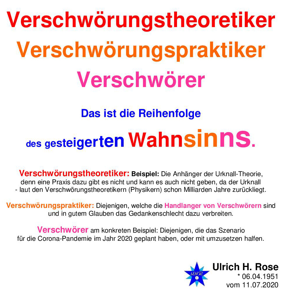 Verschwörungstheoretiker – Verschwörungspraktiker – Verschwörer. Das ist die Reihenfolge des gesteigerten Wahnsinns. Verschwörungstheoretiker: Beispiel: Die Anhänger der Urknall-Theorie, denn eine Praxis dazu gibt es nicht und kann es auch nicht geben, da der Urknall – laut den Verschwörungstheoretikern (Physikern) schon Milliarden Jahre zurückliegt. Verschwörungspraktiker: Diejenigen, welche die Handlanger von Verschwörern sind und in gutem Glauben das Gedankenschlecht dazu verbreiten. Verschwörer am konkreten Beispiel: Diejenigen, die das Szenario für die Corona-Pandemie im Jahr 2020 geplant haben, oder mit umzusetzen halfen. Spruch von Ulrich H. Rose vom 11.07.2020