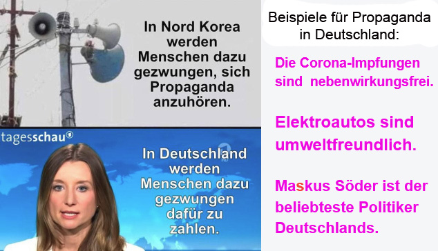 In Nord-Korea werden Menschen gezwungen, sich Propaganda anzuhören. tagesschau. In Deutschland werden Menschen gezwungen dafür (für die Propaganda) zu zahlen. Beispiele für Propaganda in Deutschland: