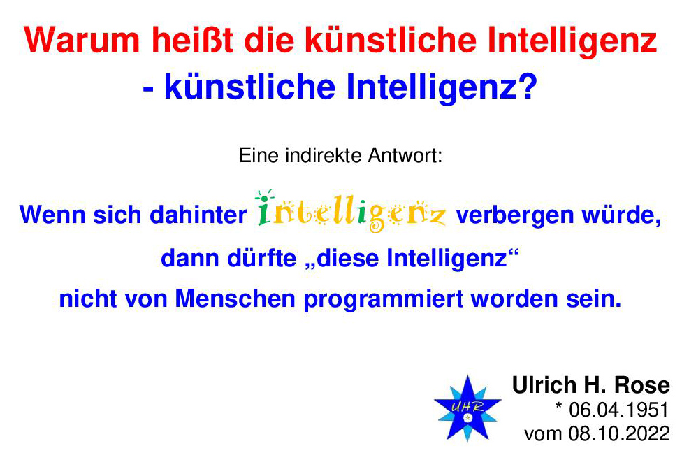 Warum heißt die künstliche Intelligenz – künstliche Intelligenz? Eine indirekte Antwort: Wenn sich dahinter Intelligenz verbergen würde, dann dürfte „diese Intelligenz“ nicht von Menschen programmiert worden sein. Ulrich H. Rose vom 08.10.2022