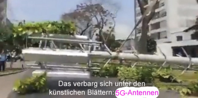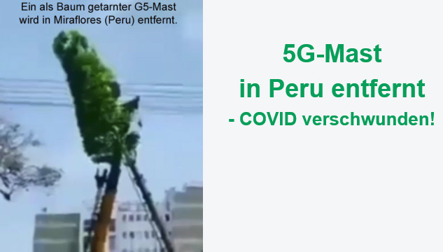 Einwohner von Miraflores in Peru, die an einer ungewöhnlichen Lungenentzündung und einer disseminierten intravasalen Gerinnung litten, zwangen die Gemeindebehörden, einen als Baum getarnten 5G-Mast zu entfernen. Und damit ist Covid auf wundersame Weise in der Gegend verschwunden. Das Video dazu: In Peru wird ein 5G-Mast – als Baum getarnt – entfernt.