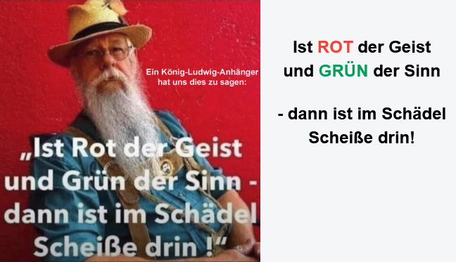 Ein König-Ludwig-Anhänger hat uns dies zu sagen: Ist ROT der Geist und GRÜN der Sinn – dann ist im Schäden Scheiße drin!