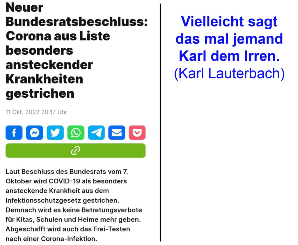 Neuer Bundesratsbeschluss: Corona aus Liste besonders ansteckender Krankheiten gestrichen. 11.10.2022