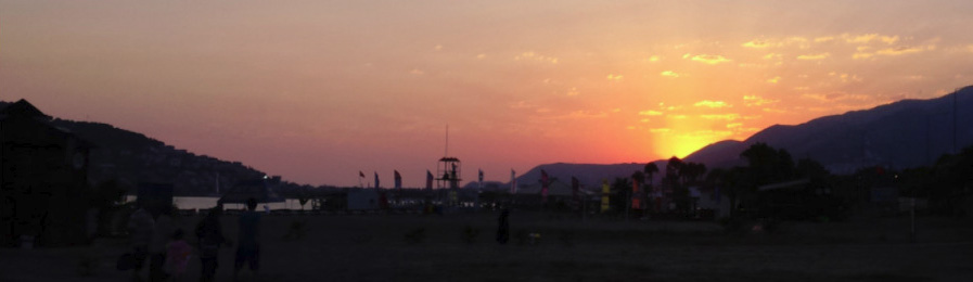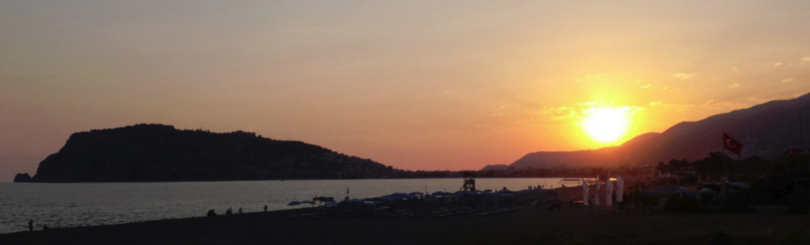 Sonnenuntergang links vom Burgberg in Alanya am 18.09.2018 um 18uhr50. Vorne der an der Grenze zwischen Kestel und Tosmur ins Mittelmeer mündende Dim Çayı