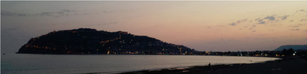 Blick am 28.06.2018 um 19:10 von der Grenze Kestel – Tosmur, dort wo der Dimçay ins Mittelmeer mündet, auf den Burgberg von Alanya.
