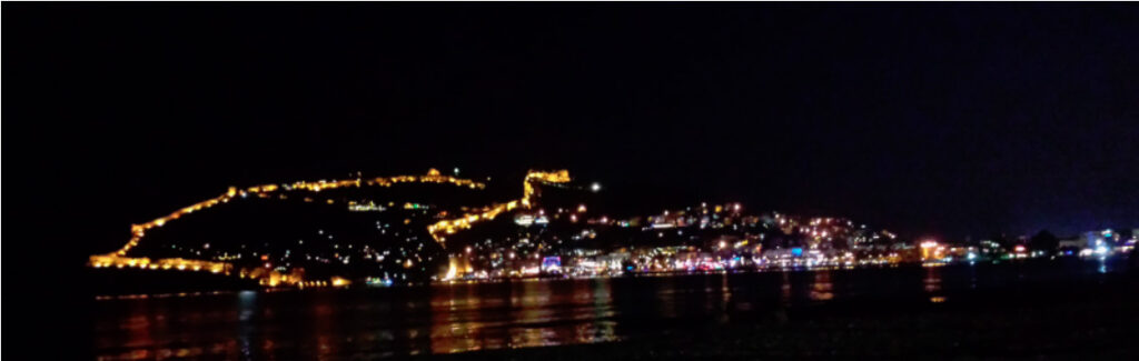 Blick auf den Burgberg von Alanya um 21:08. Die beleuchtete Festungsmauer ist gut zu sehen.