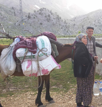 Esel bepackt mit wichtigen Dingen für die Yayla am 23.05.2018, rechts davon ein älteres Ehepaar (so um die 70 Jahre). Eyüp, der Arzt gab dem älteren Herrn Ratschläge zu seinen vorgetragenen Problemen.