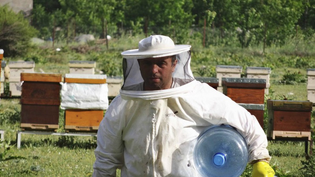 Eyüp mit leerem Zuckerwasserbehälter am 23.05.2018. Die Fütterung der Bienen ist beendet – hier auf der Zwischenstation in ca. 2.000m Höhe. In frühestens einem Monat werden die Bienen dann auf die Yayla (Alm) in 2.500m Höhe gebracht. Aktuell macht das noch keinen Sinn da dort oben noch Schnee liegt und die Bienen nichts zu Fressen haben.