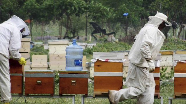 Eyüp (der Arzt) und Adnan (der Schreiner) versorgen ihre Bienen mit Zuckerwasser.