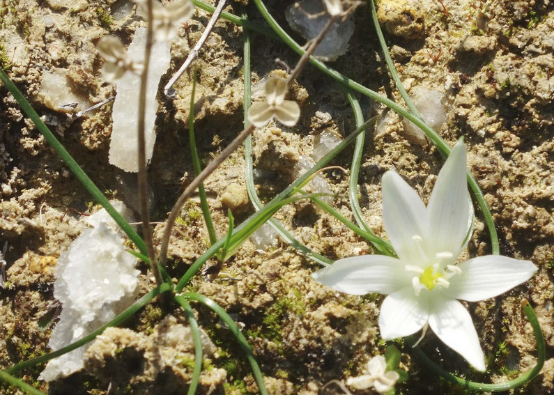 Glitzerberg Cerussit-Kristalle Weißbleierz bei Çenger und eine weiße Blüte.