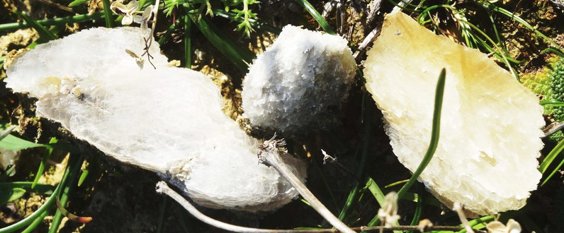 Er ist ca. 200 m lang, 50 m hoch und ebenso breit. Wenn die Sonne scheint, und die Sonne scheint hier meistens, dann glitzern im Boden viele Kristalle. Es handelt sich um Cerussit = Weißbleierz. Chemisch ist Cerussit: Blei-(II)-Carbonat. Pb[CO3]