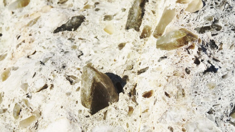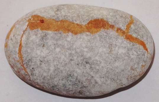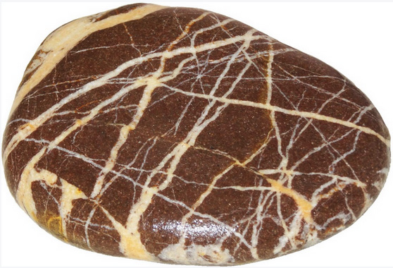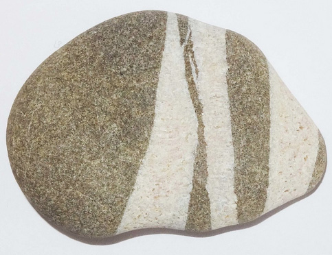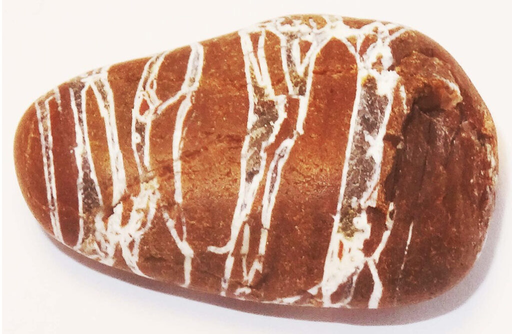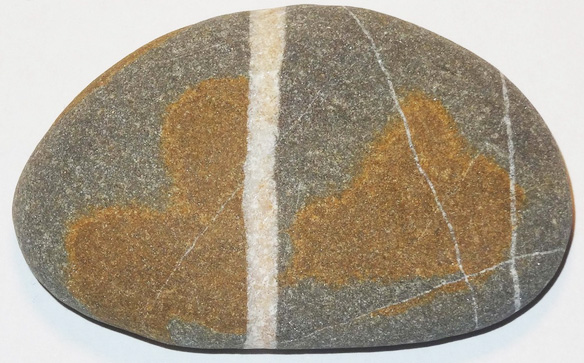 Mitte Februar 2018 fand ich ca. 100m von der Brandung entfernt einen braunen, großen, ca. 20 cm langen Stein, der dort schon gut 10 Jahre gelegen sein musste, ohne dass er gewendet wurde. Das bedeutet, dass dieser Stein eine „sandgestrahlte Seite“ hat. Diese sandgestrahlte Seite ist unterschiedlich vom Sand abgetragen worden. Die härteren Quarzgänge boten mehr Widerstand und zeichnen sich deutlich ab. Siehe selbst: