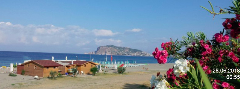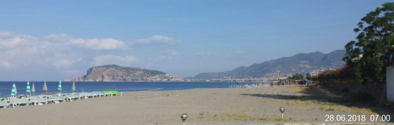 „Mein“ Badestrand in Alanya Tosmur zur Grenze nach Kestel am Dimcay mit Blick auf den Burgberg von Alanya am 28 Juni 2018 um 06:55. Der Strand ist um diese Zeit noch leer.