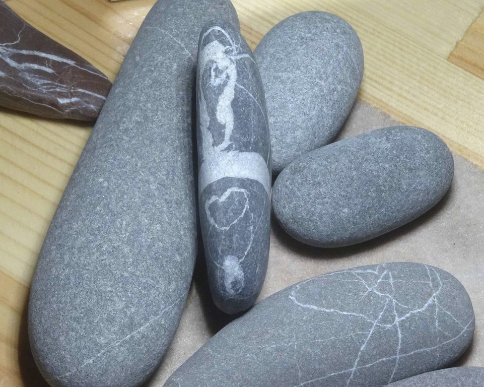 Steine vom Strand in Çenger 2018. Darunter mittig ein Herzstein.