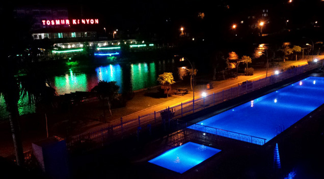 TOPRAK RIVER STAR RESIDENCE mit Pool am Dimcay bei Nacht.