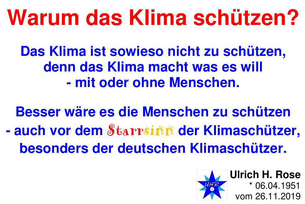 Warum das Klima schützen? Das Klima ist sowieso nicht zu schützen, denn das Klima macht was es will – mit oder ohne Menschen. Besser wäre es die Menschen zu schützen – auch vor dem Starrsinn der Klimaschützer, besonders der deutschen Klimaschützer. Ulrich H. Rose vom 26.11.2019