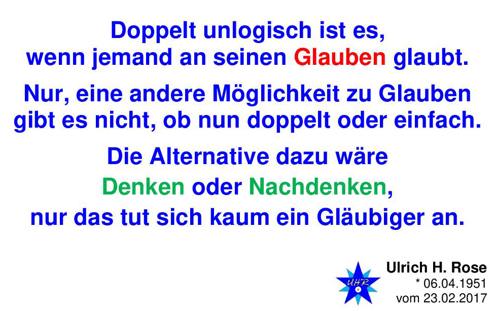 Doppelt unlogisch ist es, wenn jemand an seinen Glauben glaubt. Nur, eine andere Möglichkeit zu Glauben gibt es nicht, ob nun doppelt oder einfach. Die Alternative dazu wäre DenKen oder NachdenKen, nur das tut sich kaum ein Gläubiger an. Spruch von Ulrich H. Rose vom 23.02.2017