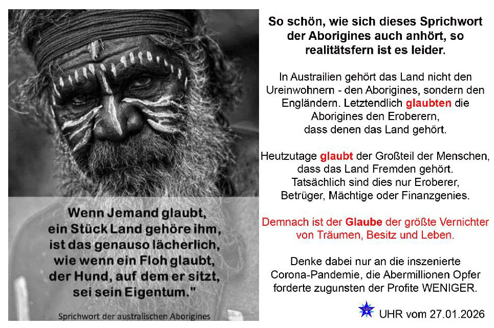 So schön, wie sich dieses Sprichwort der Aborigines auch anhört, so realitätsfern ist es leider. In Australien gehört das Land nicht den Ureinwohnern – den Aborigines, sondern den Engländern. Letztendlich glaubten die Aborigines den Eroberern, dass denen das Land gehört. Heutzutage glaubt der Großteil der Menschen, dass das Land Fremdem gehört. Tatsächlich sind diese nur Eroberer, Betrüger, Mächtige und Finanzgenies. Demnach ist der Glaube der größte Vernichter von Träumen, Besitz und Leben. Denke dabei nur an die inszenierte Corona-Pandemie, die Abermillionen Ofer forderte zugunsten der Profite WENIGER.