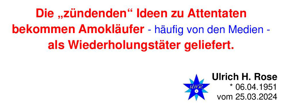Die „zündenden“ Ideen zu Attentaten bekommen Amokläufer – häufig von den Medien – als Wiederholungstäter geliefert. Ulrich H. Rose vom 25.03.2024