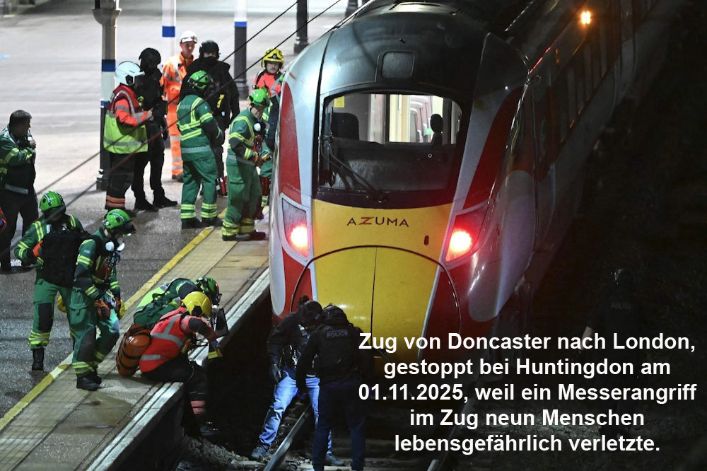 Und ein weiterer Nachtrag am 02.11.2025, nachdem in den Medien von einem Messerangriff am 01.11.2025 in einem Zug von Doncaster nach London berichtet wurde, wo 9 Menschen lebensgefährlich verletzt worden. Der Zug wurde in Hintington gestoppt, damit Polizisten die vielen veränstigten Passagiere befreiten.