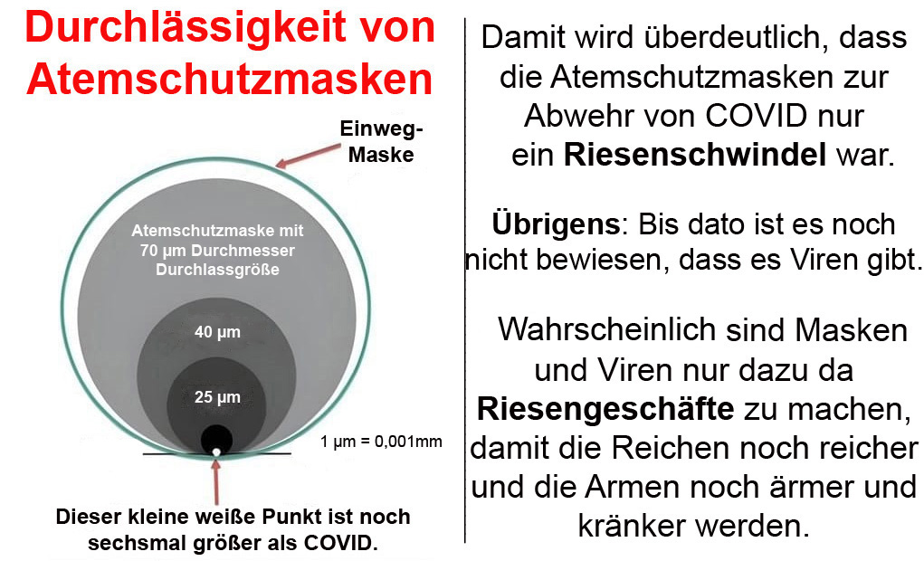Damit wird überdeutlich, dass die Atemschutzmasken zur Abwehr von COVID nur ein Riesenschwindel war. Wahrscheinlich sind Masken und Viren nur dazu da Riesengeschäfte zu machen, damit die Reichen noch reicher und die Armen noch ärmer und kränker werden.