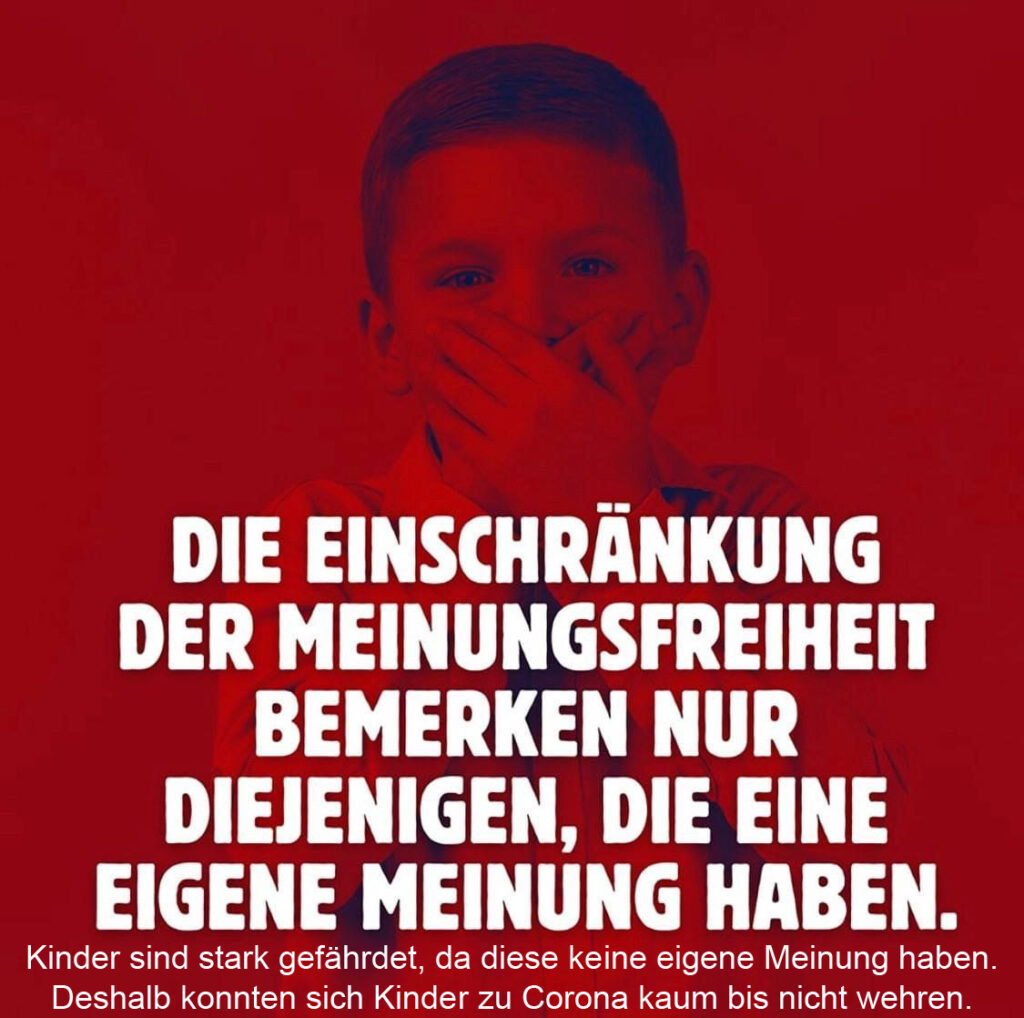 Die Einschränkung der Meinungsfreiheit bemerken nur diejenigen, die eine eigene Meinung haben. Kinder sind stark gefährdet, da diese keine eigene Meinung haben (können). Deshalb konnten sich Kinder zu Corona kaum bis nicht wehren.