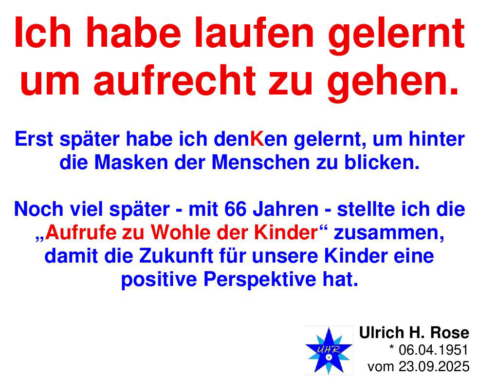 Ich habe laufen gelernt um aufrecht zu gehen. Erst später habe ich denKen gelernt, um hinter die Masken der Menschen zu blicken. Noch viel später – mit 66 Jahren – stellte ich die „Aufrufe zu Wohle der Kinder“ zusammen, damit die Zukunft für unsere Kinder eine positive Perspektive hat. Ulrich H. Rose vom 23.09.2025