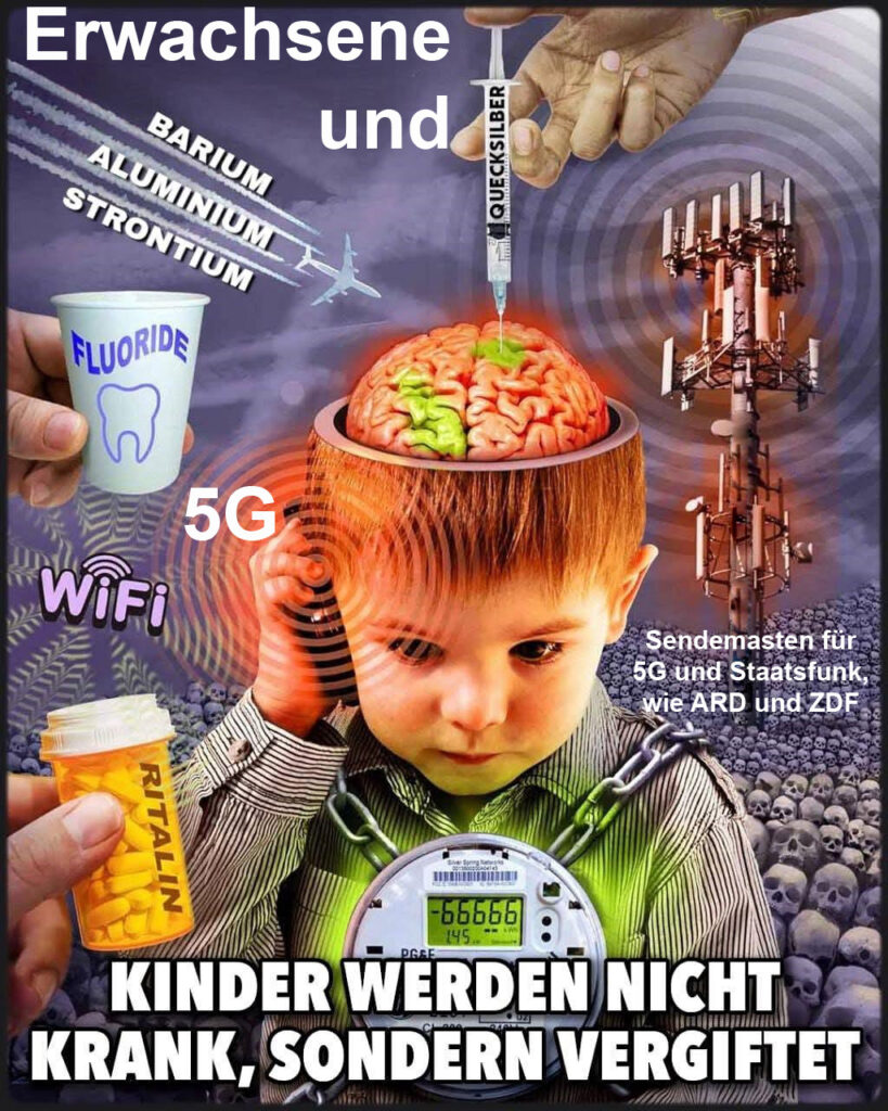 Erwachsene und Kinder werden nicht krank, sondern vergiftet. Beispiele: Chemtrails mit Barium, Aluminium, Strontium. Fluoride in der Zahnpasta. WiFi mit 5G. Ritalin für verhaltensauffällige Kinder. Quecksilber in Impfungen. Sendemasten für 5G und Staatsfunk, wie ARD und ZDF.