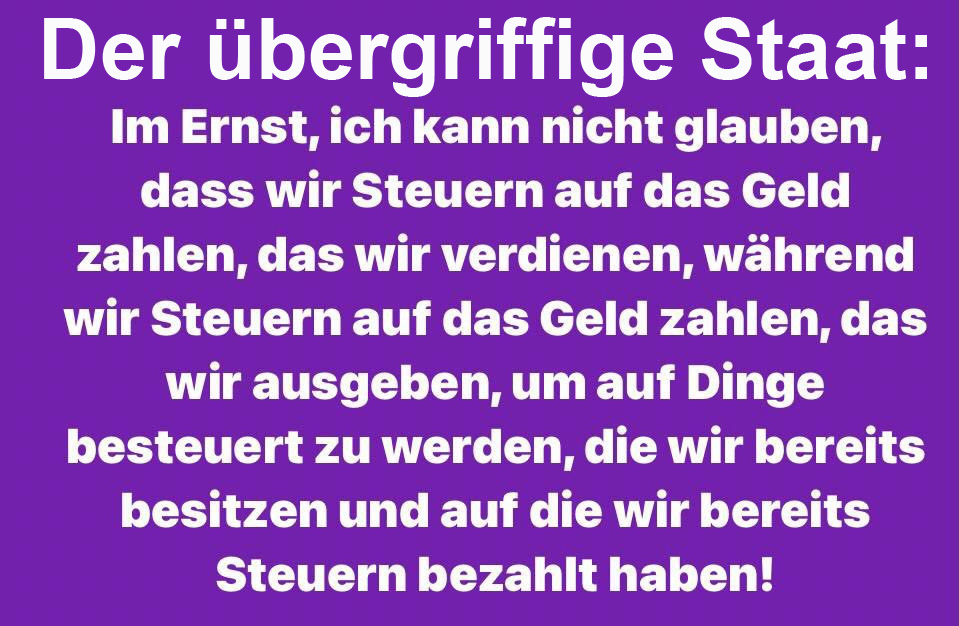 Der übergriffige Staat: Im Ernst, ich kann nicht glauben, dass wir Steuern auf das Geld zahlen, das wir verdienen, während wir Steuern auf das Geld zahlen, das wir ausgeben, um auf Dinge besteuert zu werden, die wir bereits besitzen und auf die wir bereits Steuern gezahlt haben.