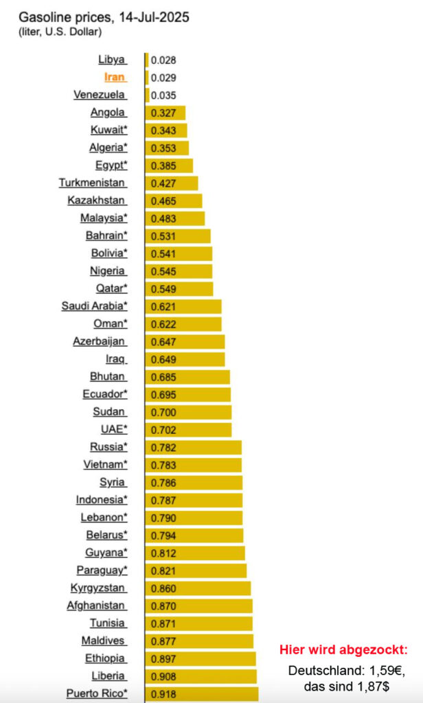 Gasoline prices. Benzin-Preise am 14.07.2025 von 3 bis 90 Cent. Hier wird abgezockt: Deutschland 1,59€, das sind 1,87$. In der Türkei waren das am 14.07. ca. 54 TL, das sind ca. 1,15€.