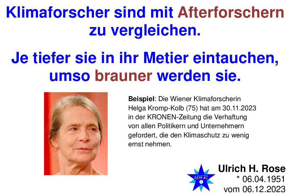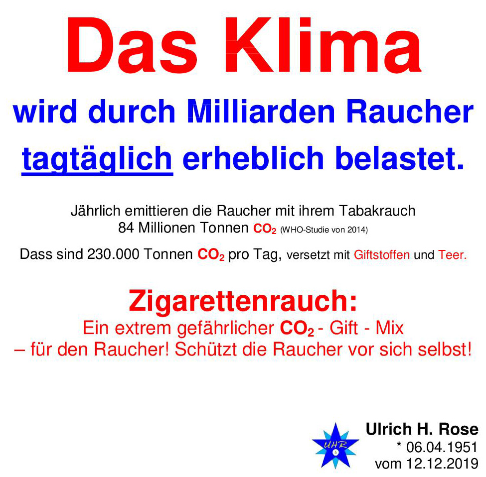 Das Klima wird durch Milliarden Raucher tagtäglich erheblich belastet. Jährlich emittieren die Raucher mit ihrem Tabakrauch 84 Millionen Tonnen CO2 (WHO-Studie von 2014) Dass sind 230.000 Tonnen CO2 pro Tag, versetzt mit Giftstoffen und Teer. Zigarettenrauch: Ein extrem gefährlicher CO2 – Gift – Mix – für den Raucher! Schützt die Raucher vor sich selbst! Ulrich H. Rose vom 12.12.2019