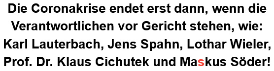 Die Coronakrise endet erst dann, wenn die Verantwortlichen vor Gericht stehen, wie: Karl Lauterbach, Jens Spahn, Lothar Wieler, Prof. Dr. Klaus Cichutek und Maskus Söder!