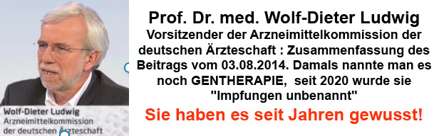 Prof. Dr. med. Wolf-Dieter Ludwig Vorsitzender der Arzneimittelkommission der deutschen Ärzteschaft : Zusammenfassung des Beitrags vom 03.08.2014. Damals nannte man es noch GENTHERAPIE, seit 2020 wurde sie „Impfungen unbenannt“. Sie haben es seit Jahren gewusst!